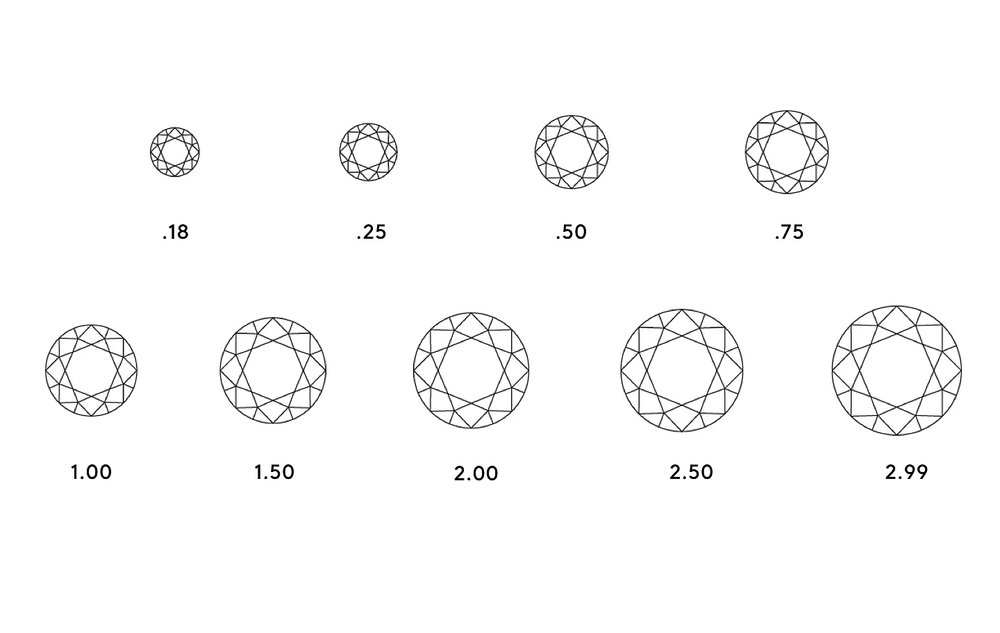 A carat equals 200 milligrams, or 0.007 ounces. Although the weight in carat is a measurable value, it is important to note that the size of a diamond does not increase linearly with the carat weight. In other words, a diamond of 2 carat is not twice as large as a diamond of 1 carat; It will seem slightly larger, but not twice as big.