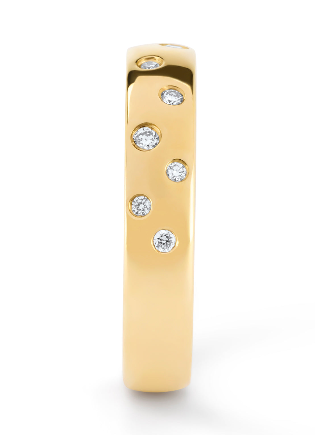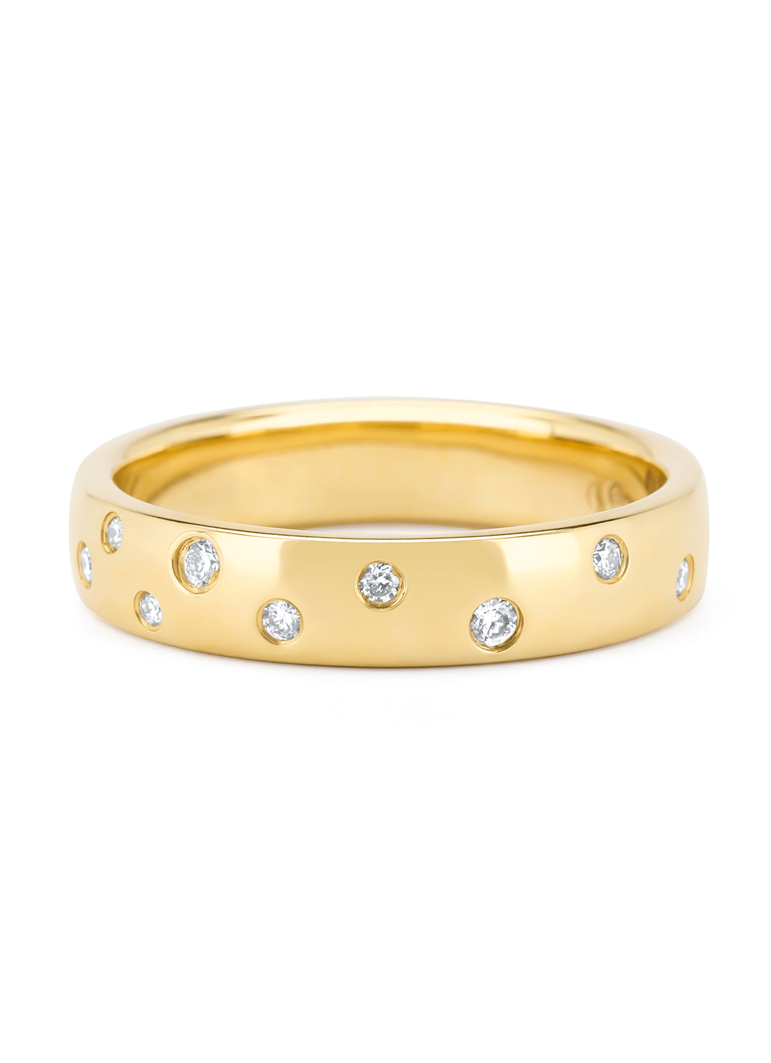 Deze trouwring van Diamond Point is vervaardigd uit 14 karaat geelgoud (4.33 gr.) en is gezet met 10 briljant geslepen diamanten met een totaalgewicht van 0.11 ct. De ring heeft een breedte van 4 mm. en een hoogte van 1.7 mm.