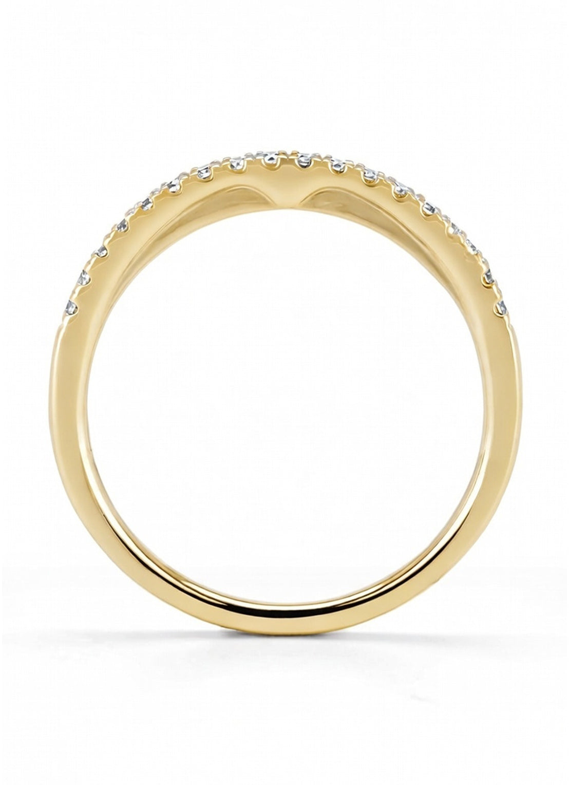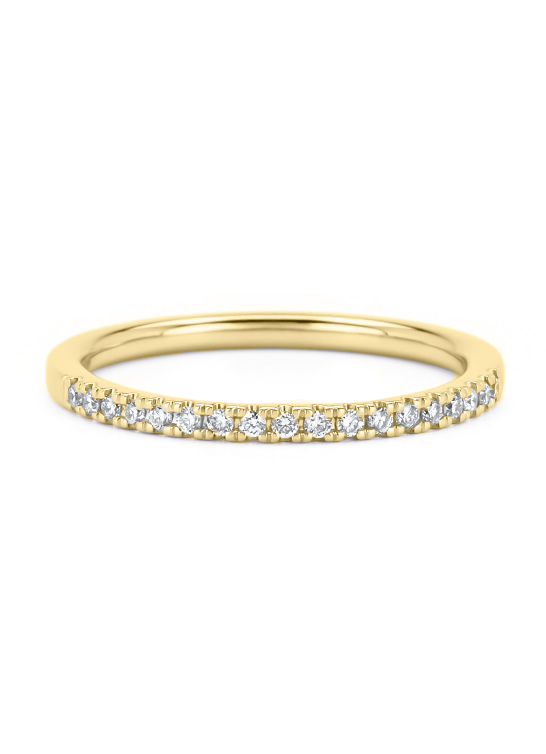 Deze aanschuifring van Diamond Point is vervaardigd uit 14 karaat geelgoud (1.7 gr.) en is gezet met 18 briljant geslepen diamanten met een totaalgewicht van 0.14 ct. De ring heeft een breedte van 1.6 mm.