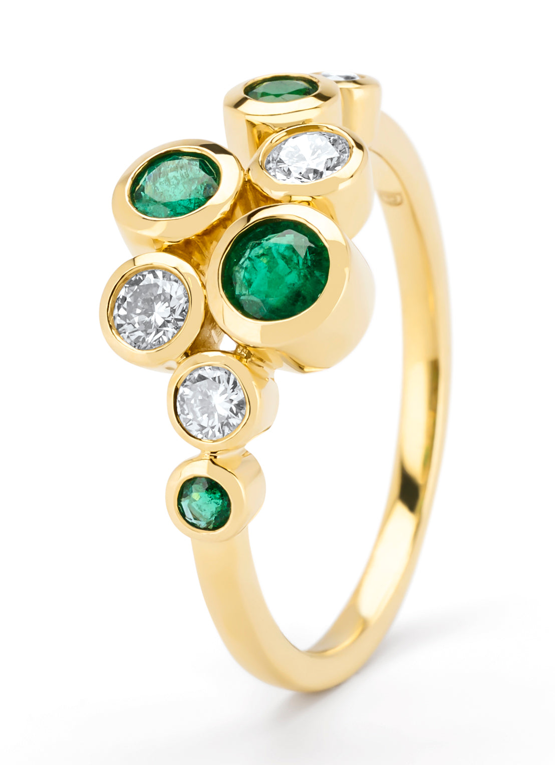 Deze ring gezet met kleurstenen van Diamond Point is vervaardigd uit 14 karaat geelgoud (3 gr.) en is gezet met smaragden en briljant geslepen diamanten met een totaalgewicht van 0.28 ct. De ring heeft een minimale breedte van 1.8 mm., maximale breedte van 10 mm. en een hoogte van 4 mm.