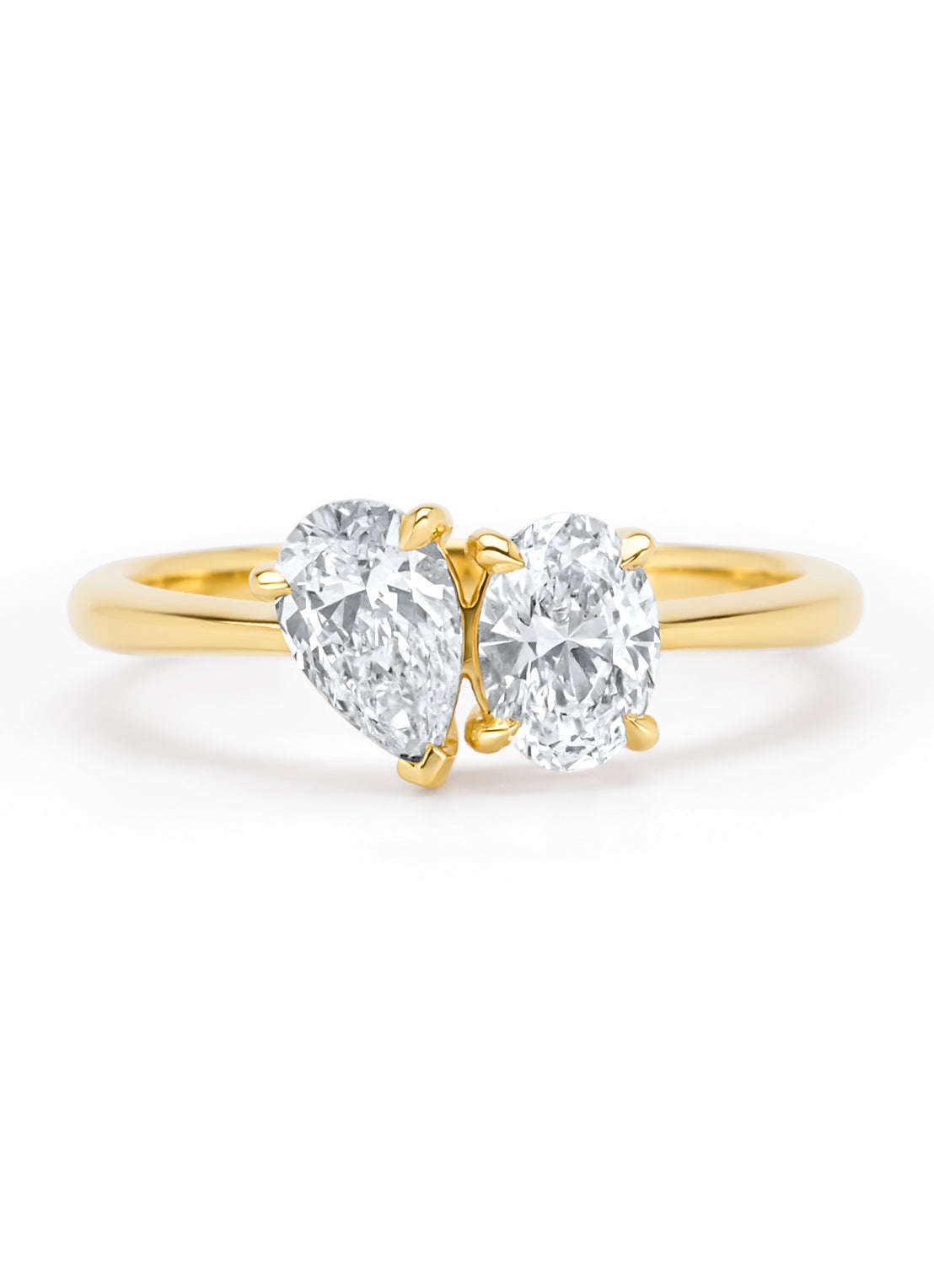 Deze solitair ring van Diamond Point is vervaardigd uit 18 karaat geelgoud (1 gr.) en is gezet met een ovaal en een peer geslepen diamant met een totaalgewicht van 1.04 ct. De ring heeft een minimale breedte van 2 mm., maximale breedte van 7 mm. en een hoogte van 3.9 mm.