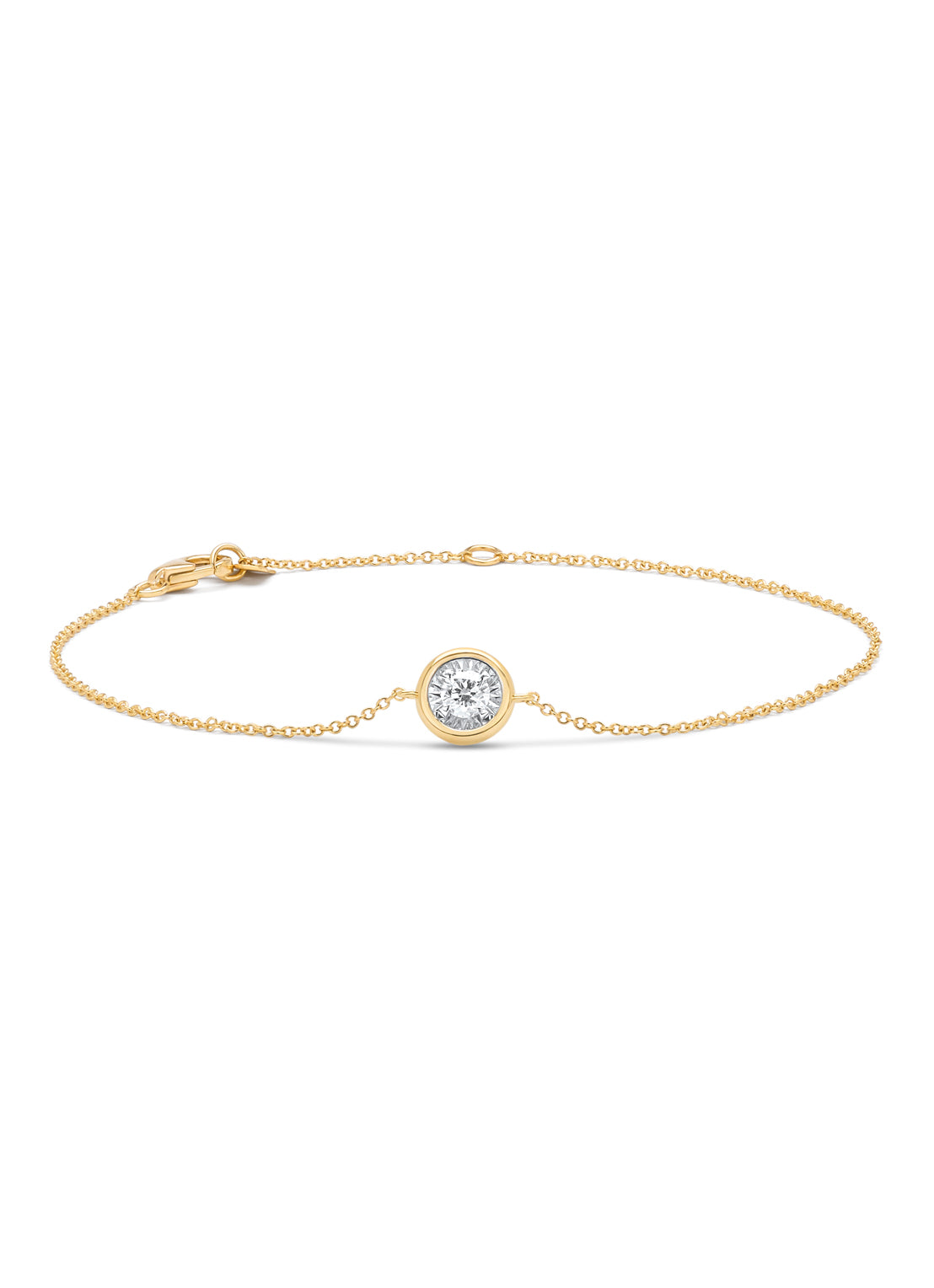 Deze armband van Diamond Point is vervaardigd uit 14 karaat geelgoud met wit rhodium (1.4 gr.) en is gezet met briljant geslepen diamant met een totaalgewicht van 0.15 ct. De diameter van de diamant is circa 3.4 mm. De armband heeft een minimale lengte van 16 cm. en een maximale lengte van 18 cm.