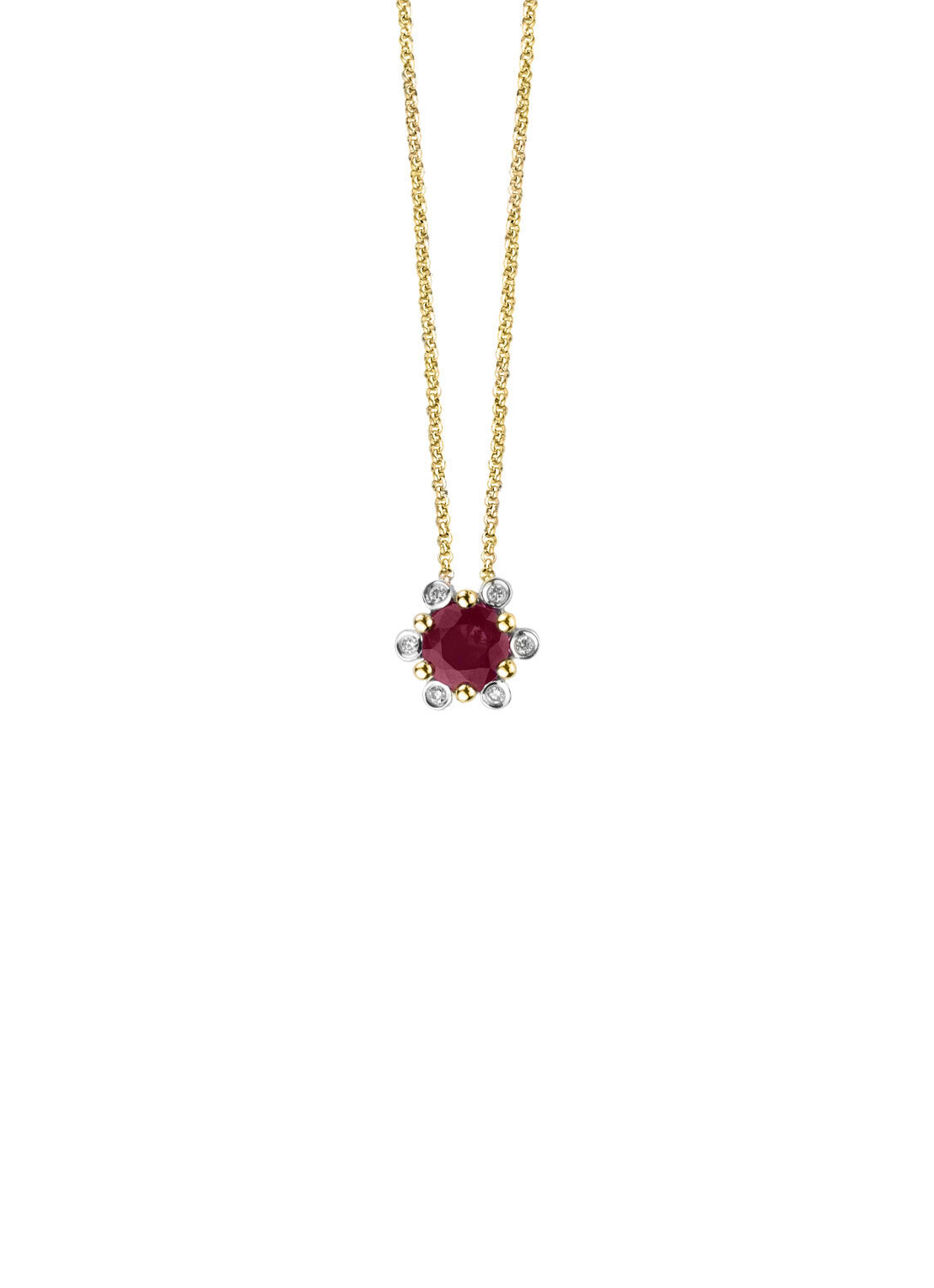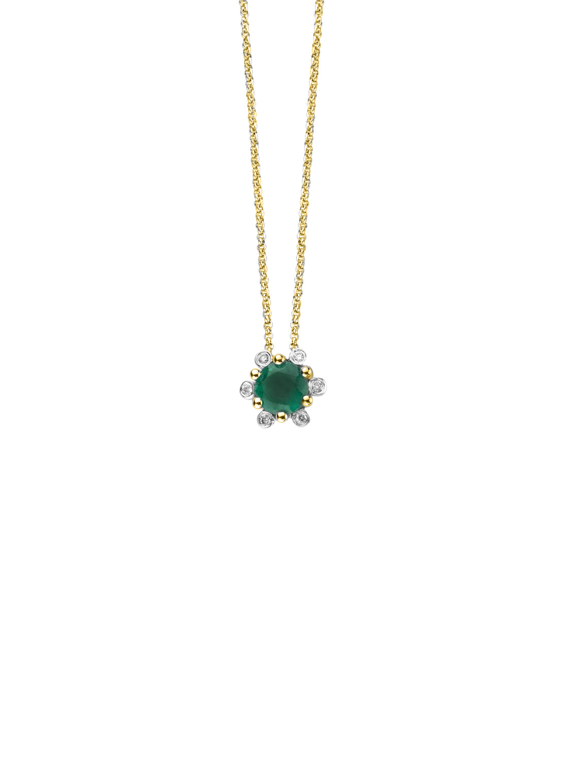 This pendant (excluding necklace) by Diamond Point is made of 14-carat yellow gold (0.71 g) and is set with a blue sapphire and six brilliant-cut diamonds with a total weight of 0.03 ct. The pendant is 6.5 mm wide.