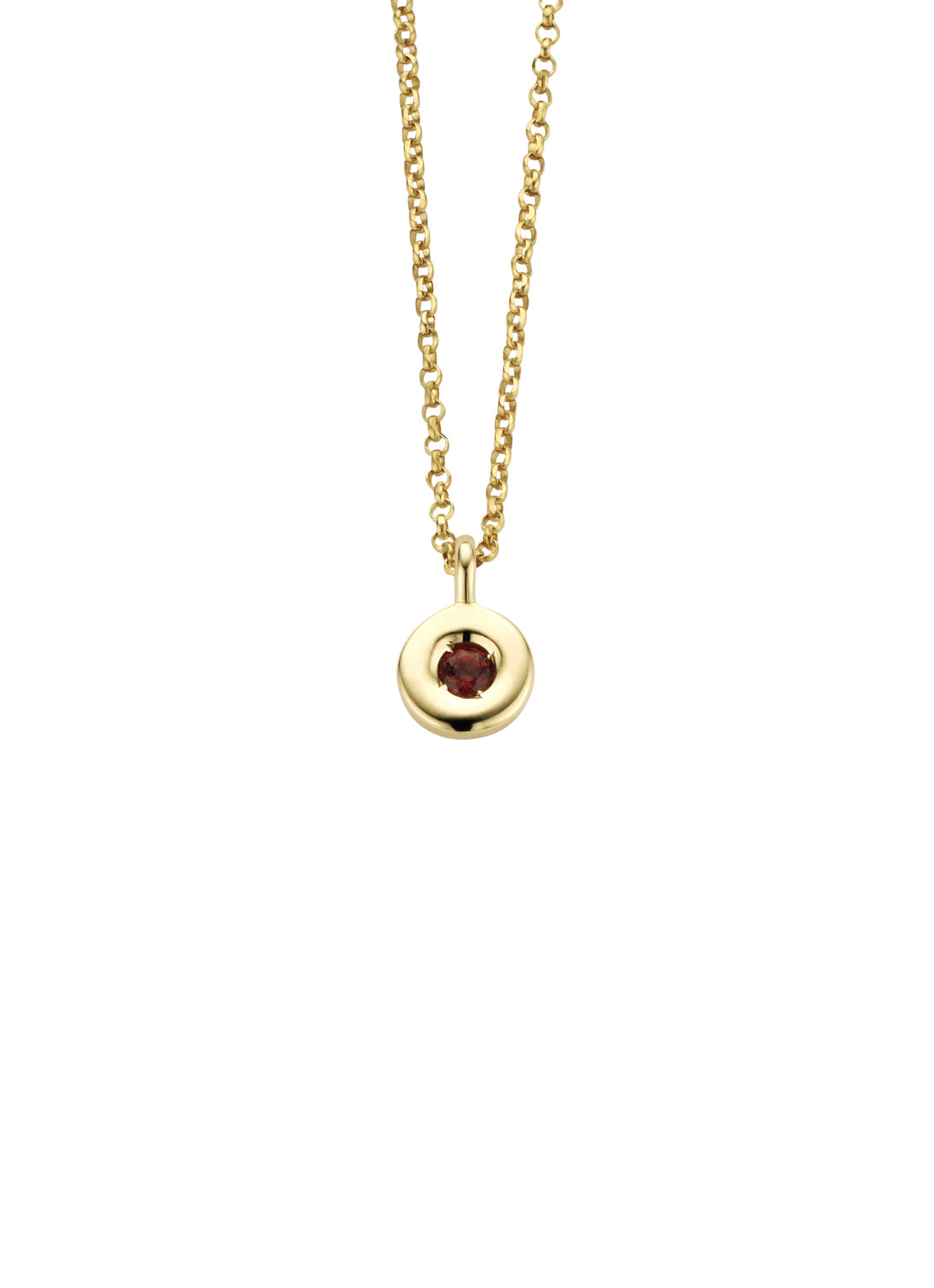 Deze robijn hanger is de geboortesteen van juli. De hanger met collier zijn vervaardigd uit 14 karaat geelgoud en wegen samen ongeveer 1,5 gr. Elk collier is voorzien van een Diamond Point monogram tag. De hanger is 8 mm lang en 5 mm breed. Het collier is op 2 lengtes te dragen: 42 of 45 cm. De Birthstones sieraden zijn gezet met maandstenen met elk een bijzondere betekenis en kracht. De robijn staat voor liefde, passie, moed en emotie.
