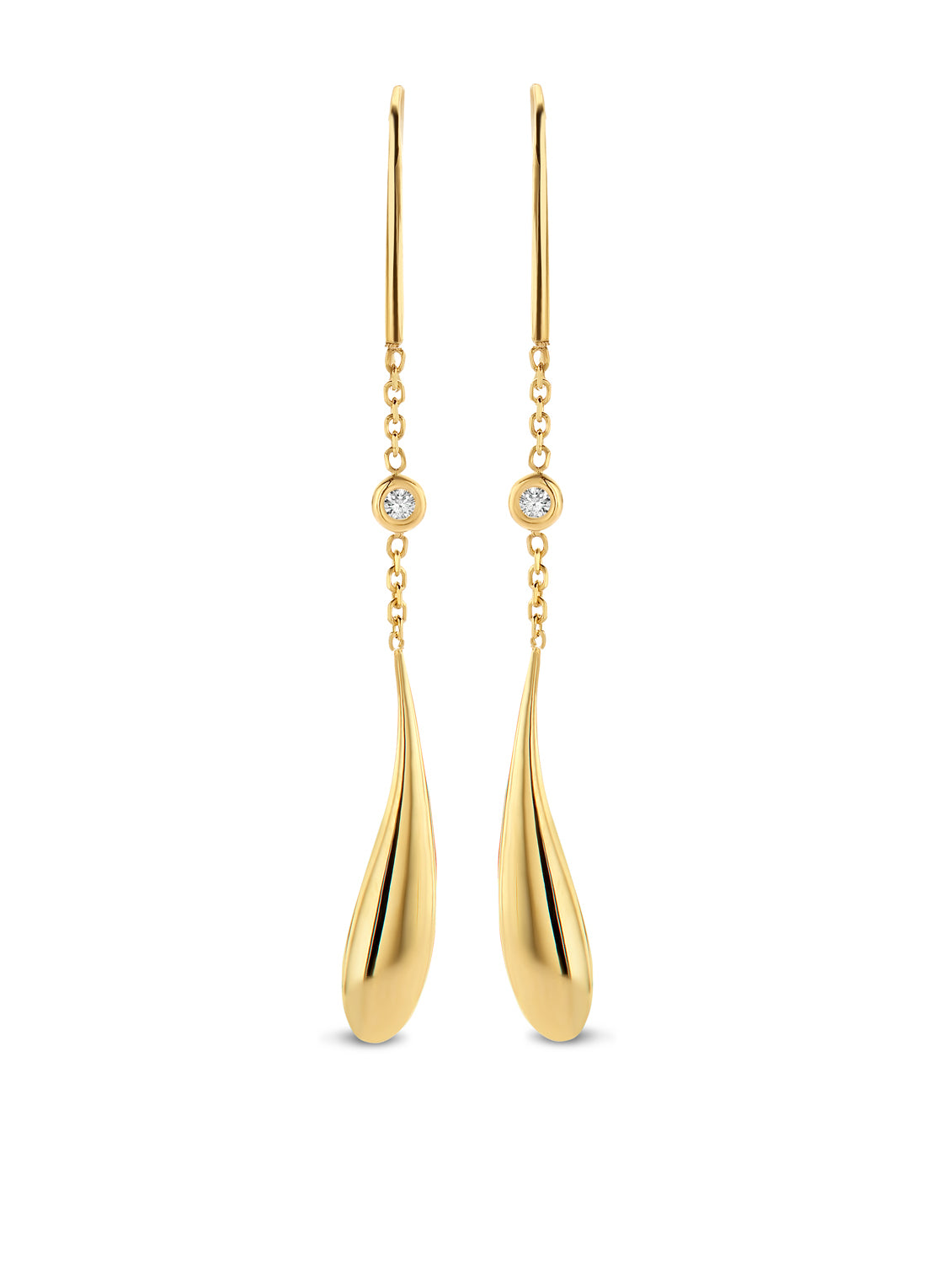 Deze oorhangers van Diamond Point zijn vervaardigd uit 14 karaat geelgoud (2.5 gr.) en zijn gezet met 2 briljant geslepen diamanten met een totaalgewicht van 0.05 ct. De Oorsieraden hebben een dikte van 1.5 mm., maximale breedte van 5 mm. en een maximale lengte van 5.6 cm.