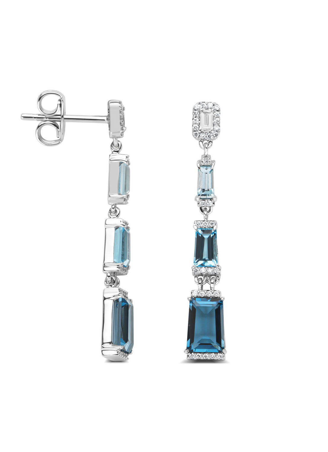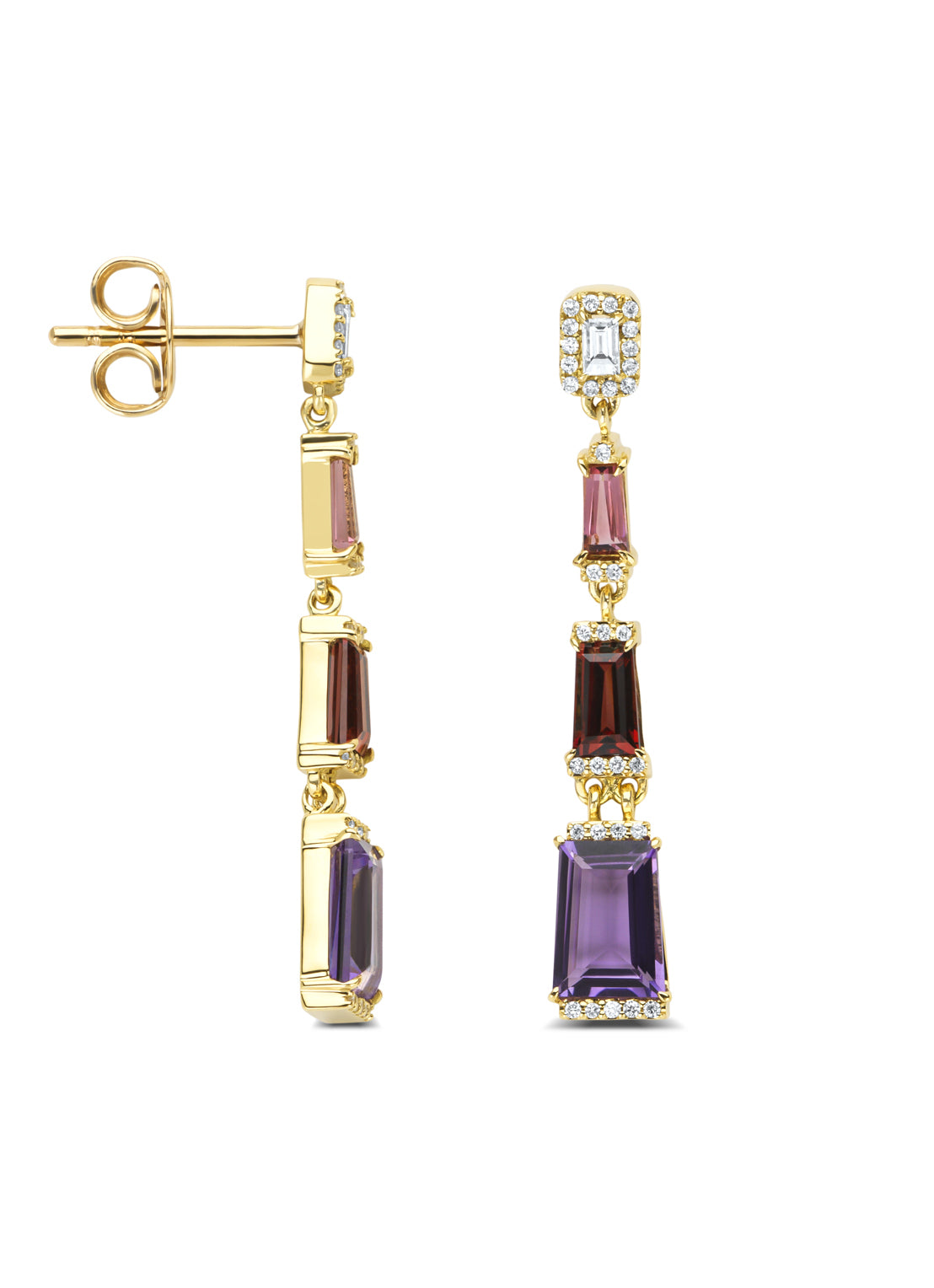 Deze oorsieraden van Diamond Point zijn vervaardigd uit 18 karaat geelgoud (3.53 gr.) en zijn gezet met 2 citrienen, 2 peridoten, 2 topazen en 2 baguette en 66 briljant geslepen diamanten met een totaalgewicht van 0.2 ct. De Oorsieraden hebben een lengte van 3.3 cm., minimale breedte van 2 mm. en een maximale breedte van 5 mm.