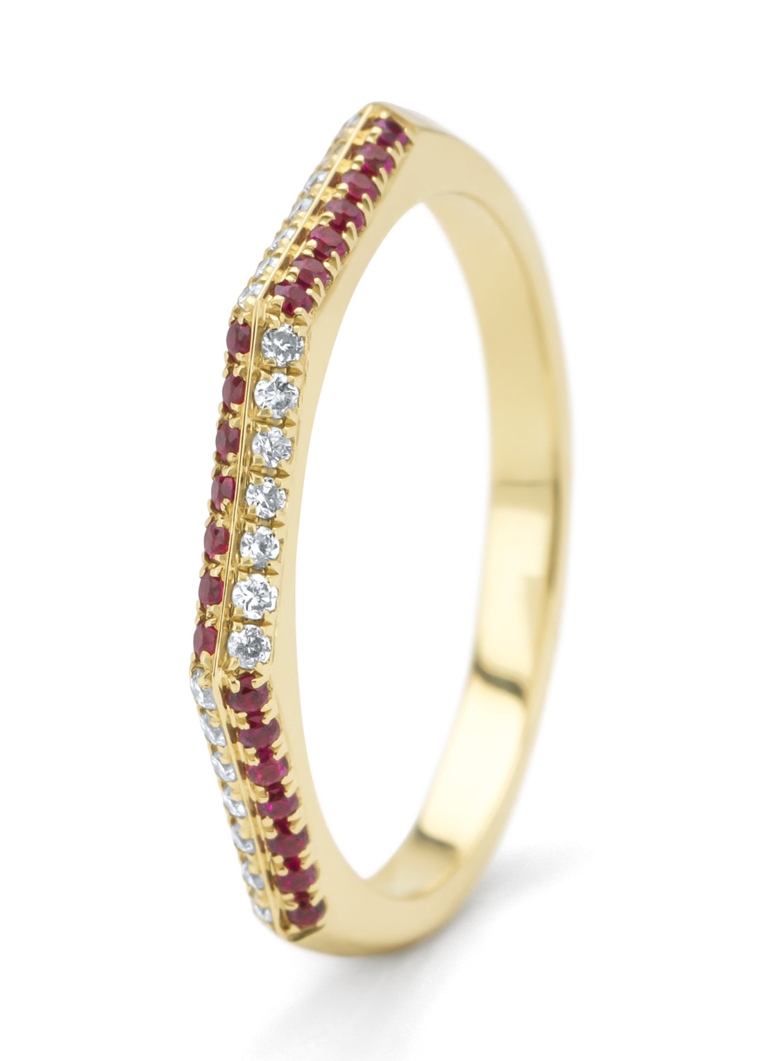 Deze ring gezet met kleurstenen van Diamond Point is vervaardigd uit 14 karaat geelgoud (2.3 gr.) en is gezet met 21 tsavorieten en 21 briljant geslepen diamanten met een totaalgewicht van 0.09 ct. De ring heeft een breedte van 2 mm. en een hoogte van 2 mm.