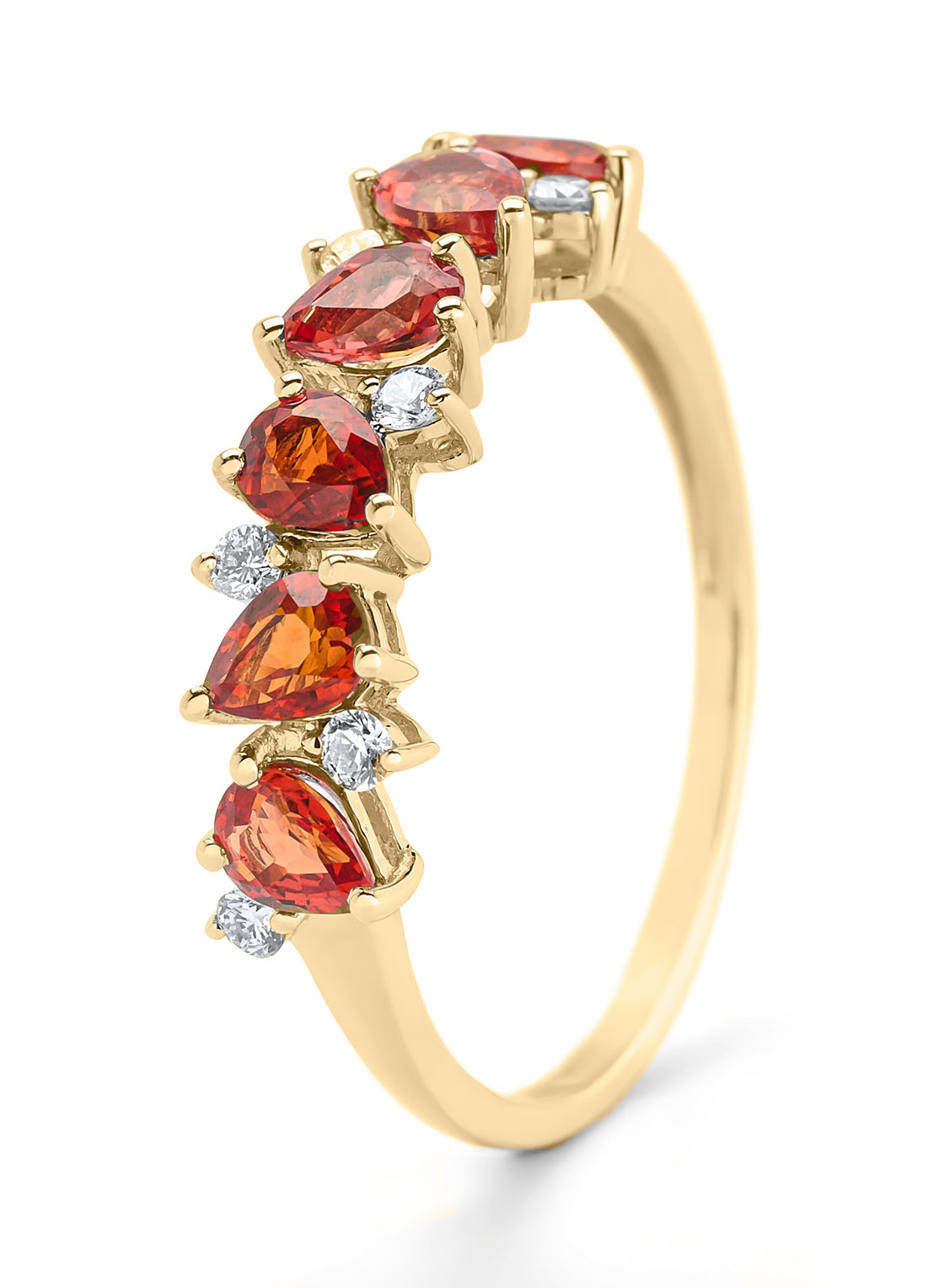 Deze ring gezet met kleurstenen van Diamond Point is vervaardigd uit 14 karaat geelgoud (1.68 gr.) en is gezet met 6 peer gele saffieren en 7 briljant geslepen diamanten met een totaalgewicht van 0.14 ct. De ring heeft een minimale breedte van 1.2 mm. en een maximale breedte van 5 mm.