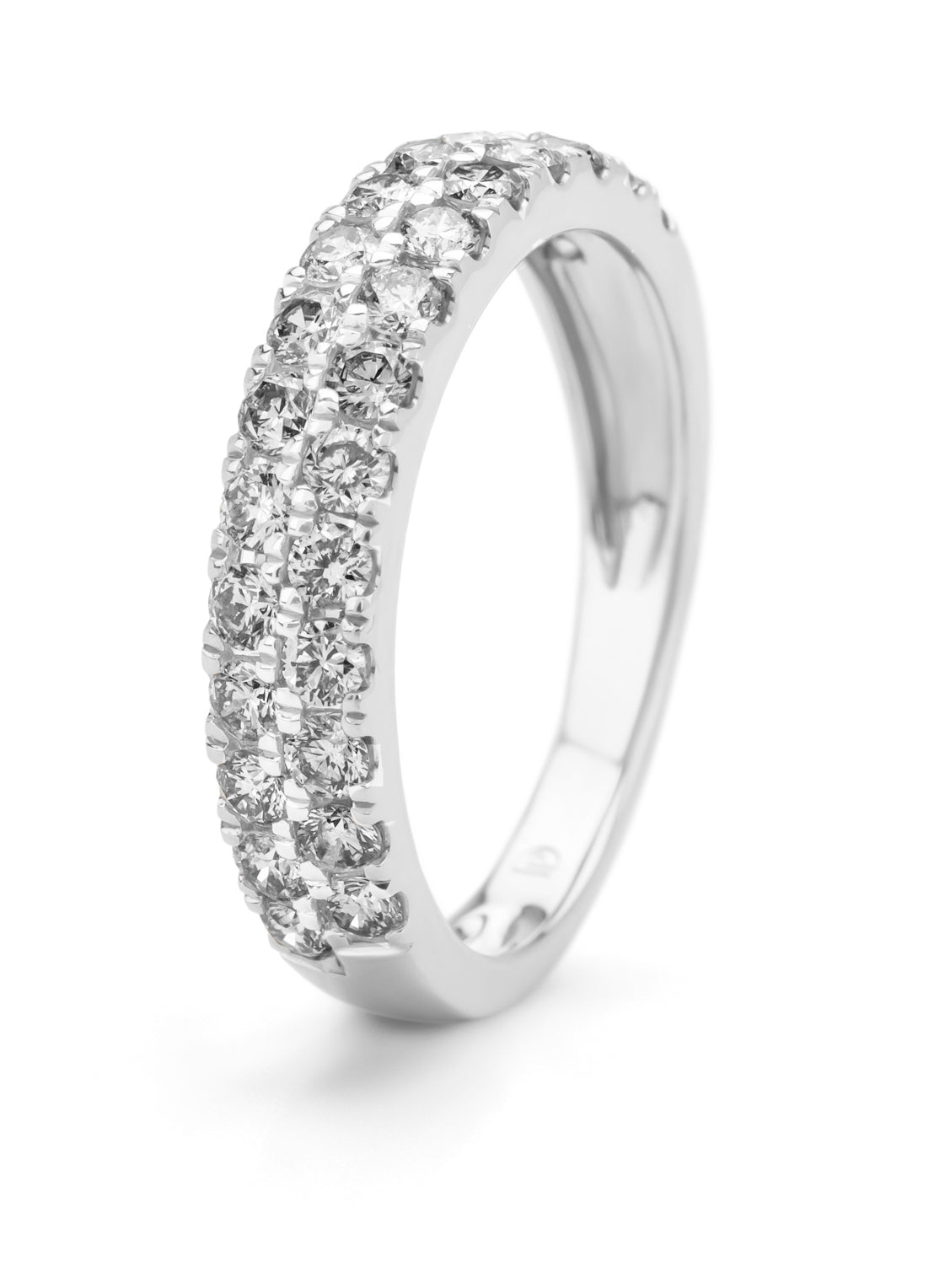 Deze alliance ring van Diamond Point is vervaardigd uit 14 karaat witgoud (3 gr.) en is gezet met 29 briljant geslepen diamanten met een totaalgewicht van 1.07 ct. De ring heeft een minimale breedte van 2.5 mm. en een maximale breedte van 4.2 mm.