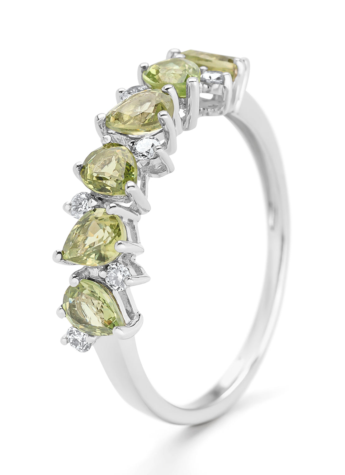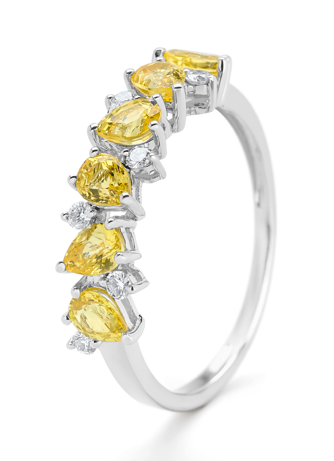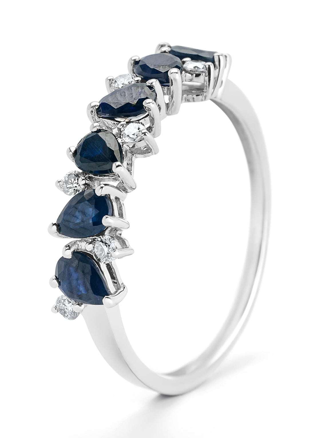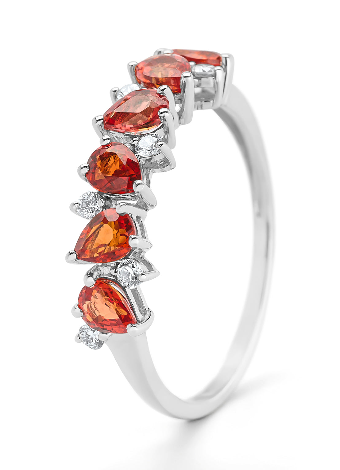 Deze ring gezet met kleurstenen van Diamond Point is vervaardigd uit 14 karaat witgoud (1.54 gr.) en is gezet met 6 peer roze saffieren en 7 briljant geslepen diamanten met een totaalgewicht van 0.14 ct. De ring heeft een minimale breedte van 1.2 mm. en een maximale breedte van 5 mm.