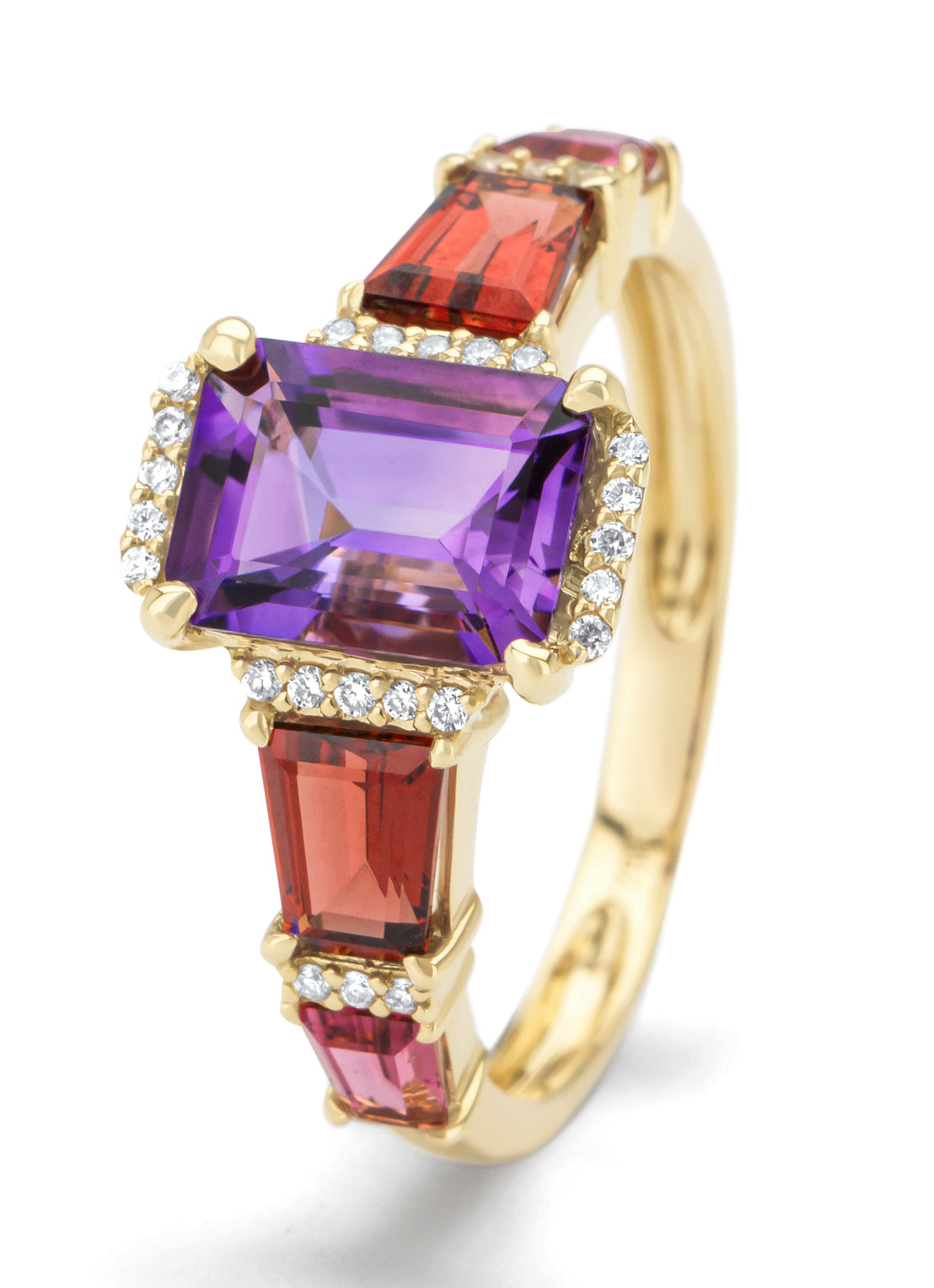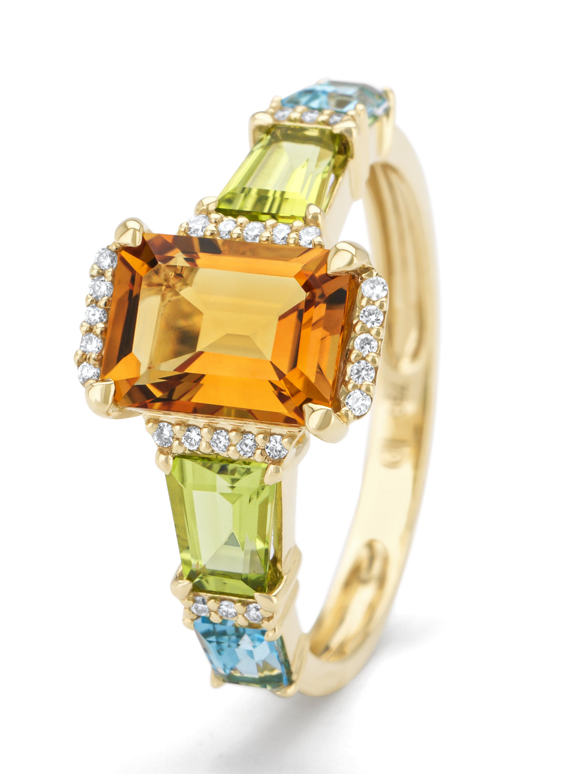Deze ring gezet met kleurstenen van Diamond Point is vervaardigd uit 18 karaat witgoud (2.52 gr.) en is gezet met london topaas, topazen en briljant geslepen diamanten met een totaalgewicht van 0.045 ct. De ring heeft een minimale breedte van 2 mm., maximale breedte van 10 mm. en een hoogte van 4.5 mm.
